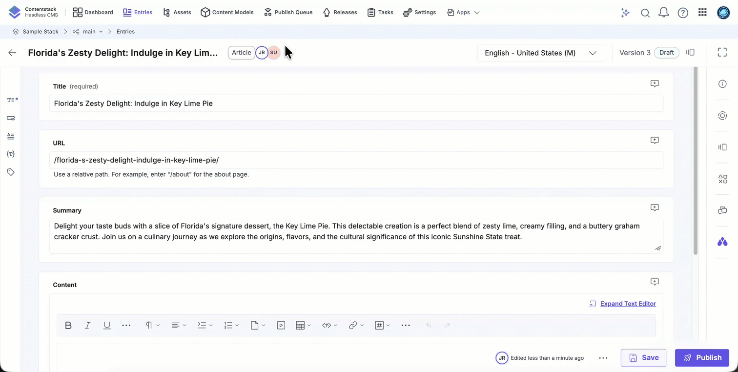 Note: If the entry has never been saved (version zero), it displays Draft Only.