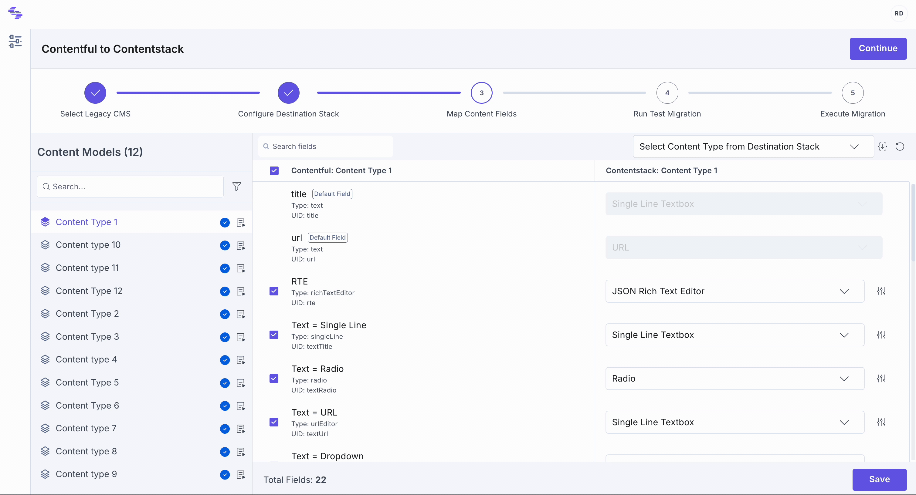 - Source content types: Displays the fields for the selected content type from the legacy CMS.