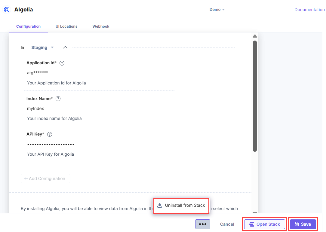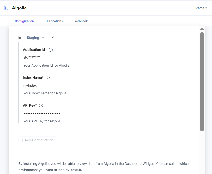 Here, you need to provide the configuration details of your Algolia account such as the Application ID, Index Name, and the API Key to let your app fetch details to and from Algolia.