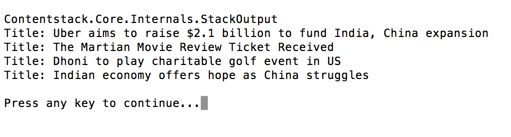 using System; using Contentstack.Core; // ContentstackClient using Contentstack.Core.Models; // Stack, Query, Entry, Asset, ContentType using Contentstack.Core.Configuration; // ContentstackOptions using ContentstackModels.Models; using System.Threading.Tasks; namespace SampleTerminal { class Program { static async Task Main(string[] args) { // Initialize the Contentstack Stack ContentstackOptions contentstackOptions = new ContentstackOptions { ApiKey = "API_Key", DeliveryToken = "Delivery_Token", Environment = "Environment_Name" }; ContentstackClient contentstackClient = new ContentstackClient(contentstackOptions); Query query = contentstackClient.ContentType("news").Query(); query.IncludeReference("category"); ContentstackCollection<News> listEntries = await query.Find<News>(); String newsTitle = string.Empty; foreach (News news in listEntries.Items) { Console.WriteLine("Title : " + news.Title); } Console.ReadLine(); } } }Result
