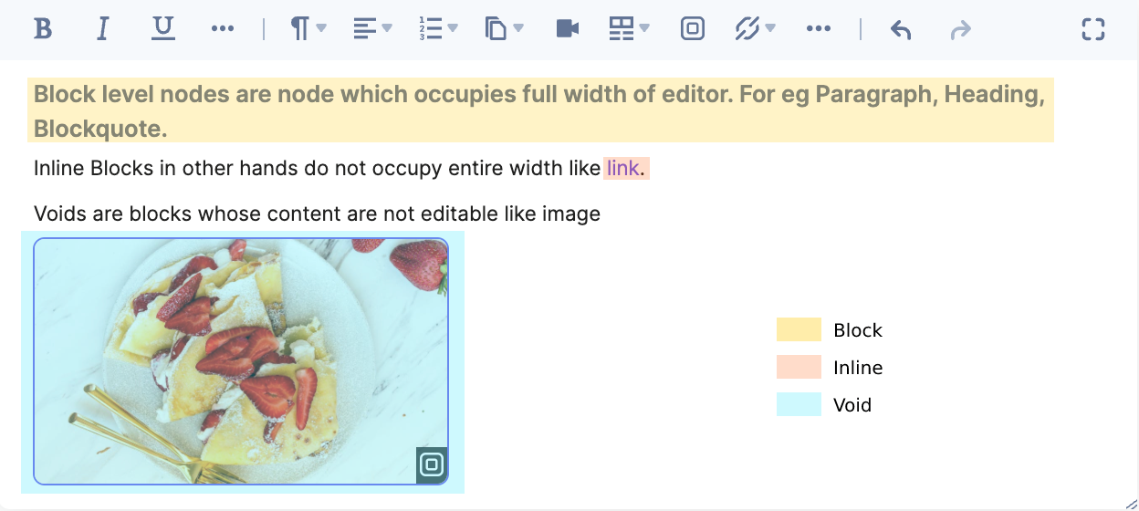 - Void: Represents self-contained, non-editable elements (e.g., images, embeds).