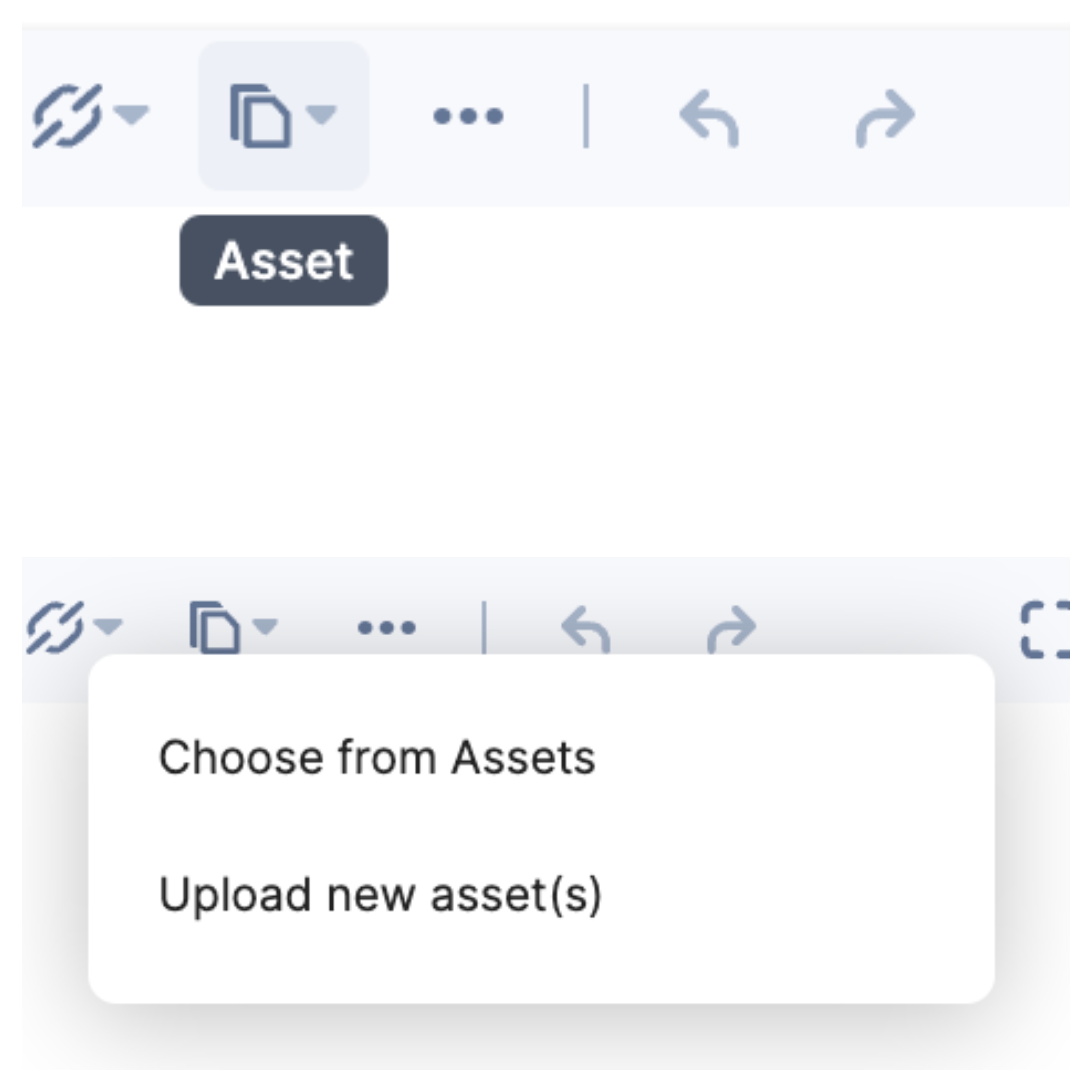 Asset.addPlugins(ChooseAsset, UploadAsset);This groups the ChooseAsset and UploadAsset plugins under a dropdown button represented by Asset.