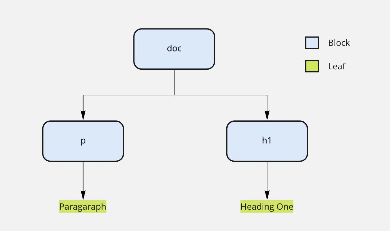 The root of the document is a special Block Node of type doc. All editor content is nested within this root node.