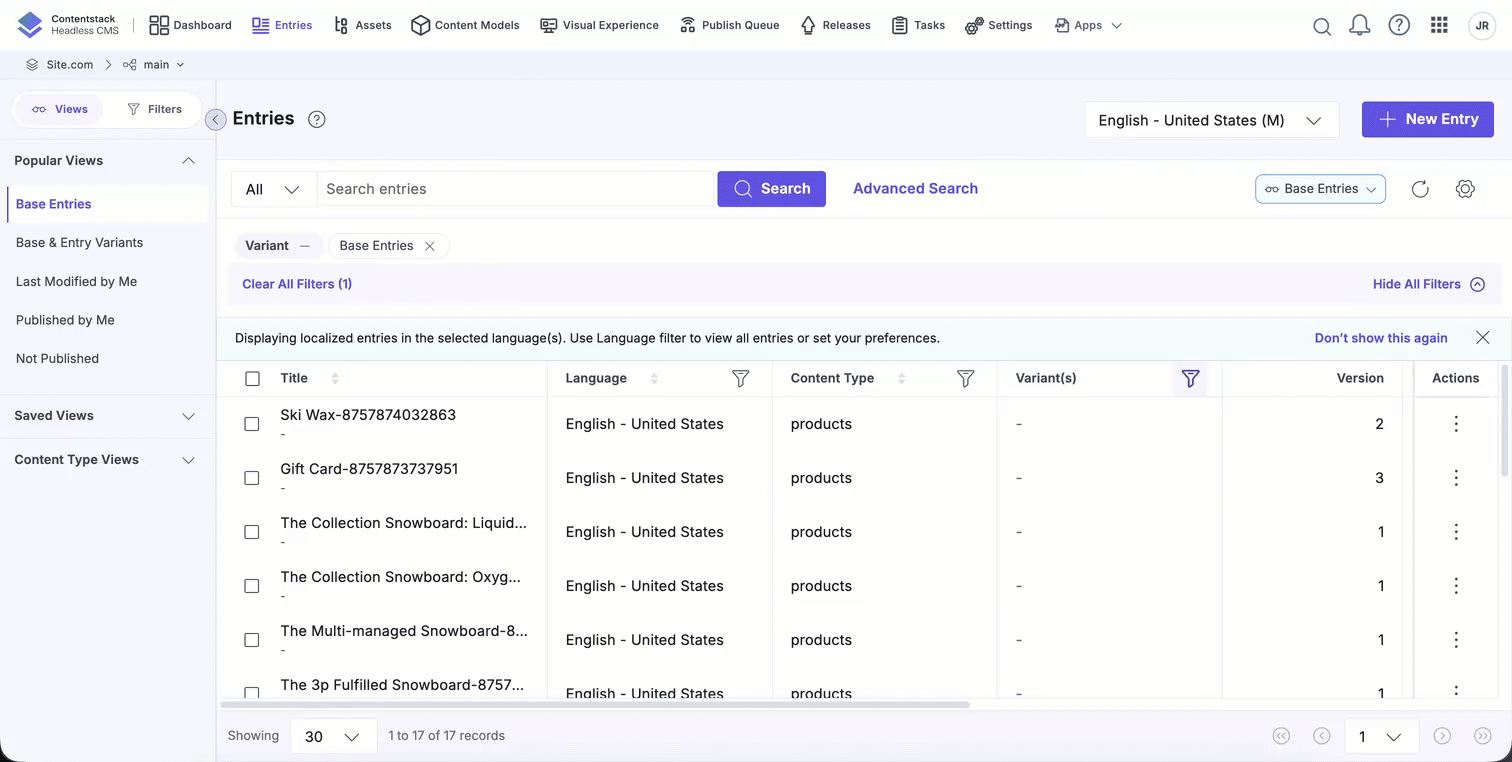 - Select a content type, environment, and locale.