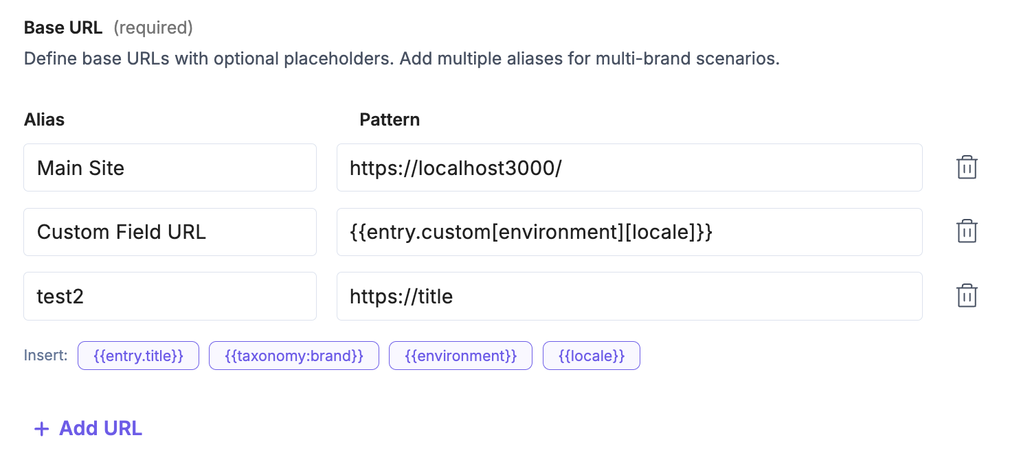 - Build preview URLs using dynamic placeholders in the pattern. Placeholders use the {{...}} syntax and can reference: