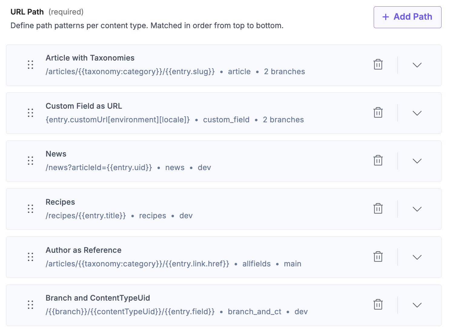 Use routing patterns to define URL structures based on entry fields and static path segments. This approach is useful when your website follows predictable URL hierarchies, such as blogs, product pages, or category-based navigation.