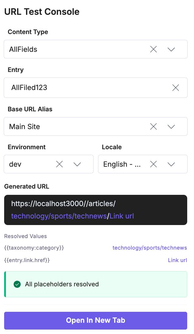 - Pattern Resolution: The system attempts to resolve all placeholders using entry data, locale, environment, and taxonomy values.