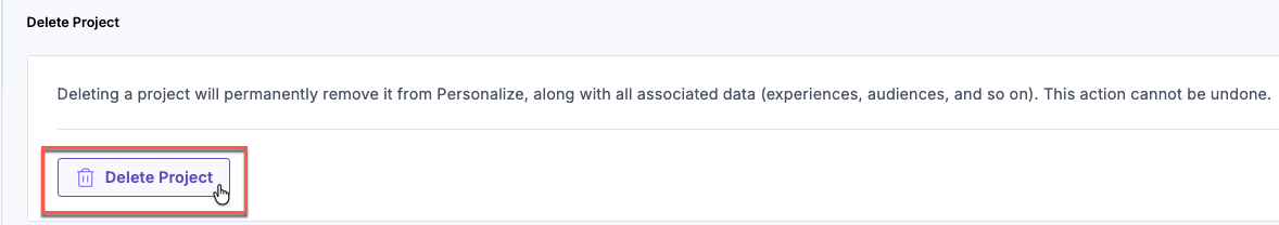 Warning: Personalize immediately removes the project and permanently deletes all associated experiences and configuration data. You cannot recover or restore the project after deletion.